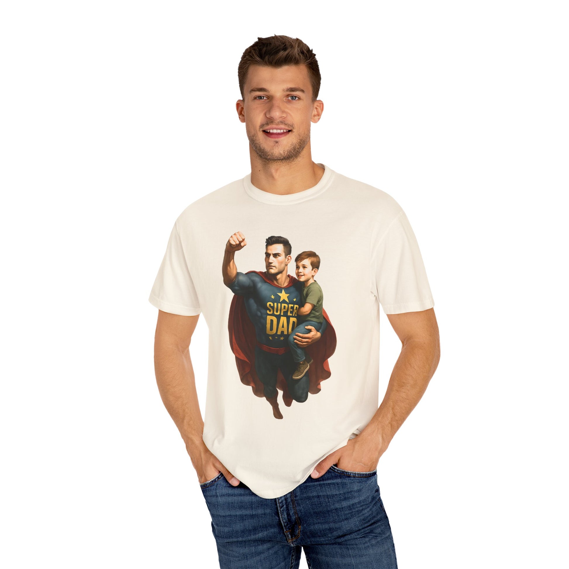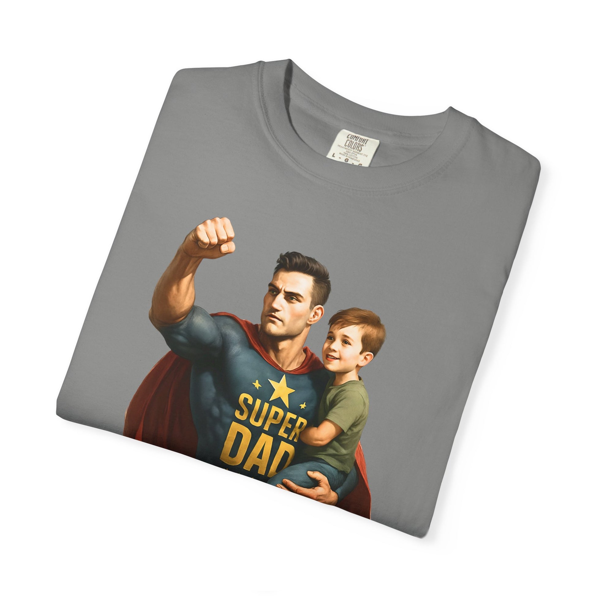 Celebrate dad with this Super Dad T-shirt. Available in multiple t-shirt colors and different looking dad's and kids. This shirt is the best dad gift for the superhero dad in your life. The soft, garment-dyed fabric and relaxed fit make it comfortable for casual or semi-formal settings. Ideal for adults looking to show appreciation for their father figures on Father's Day, your Dad's Birthday or even Christmas!