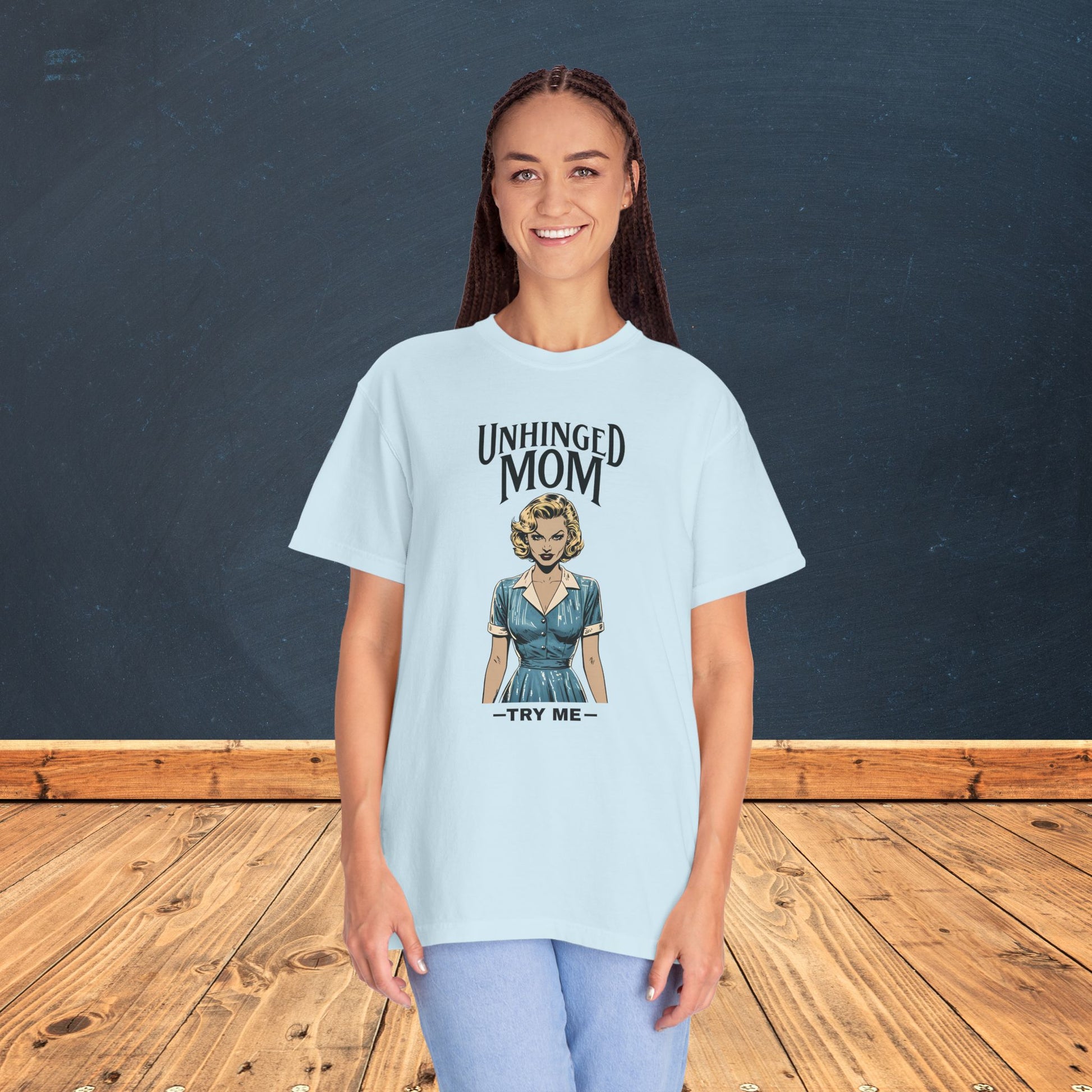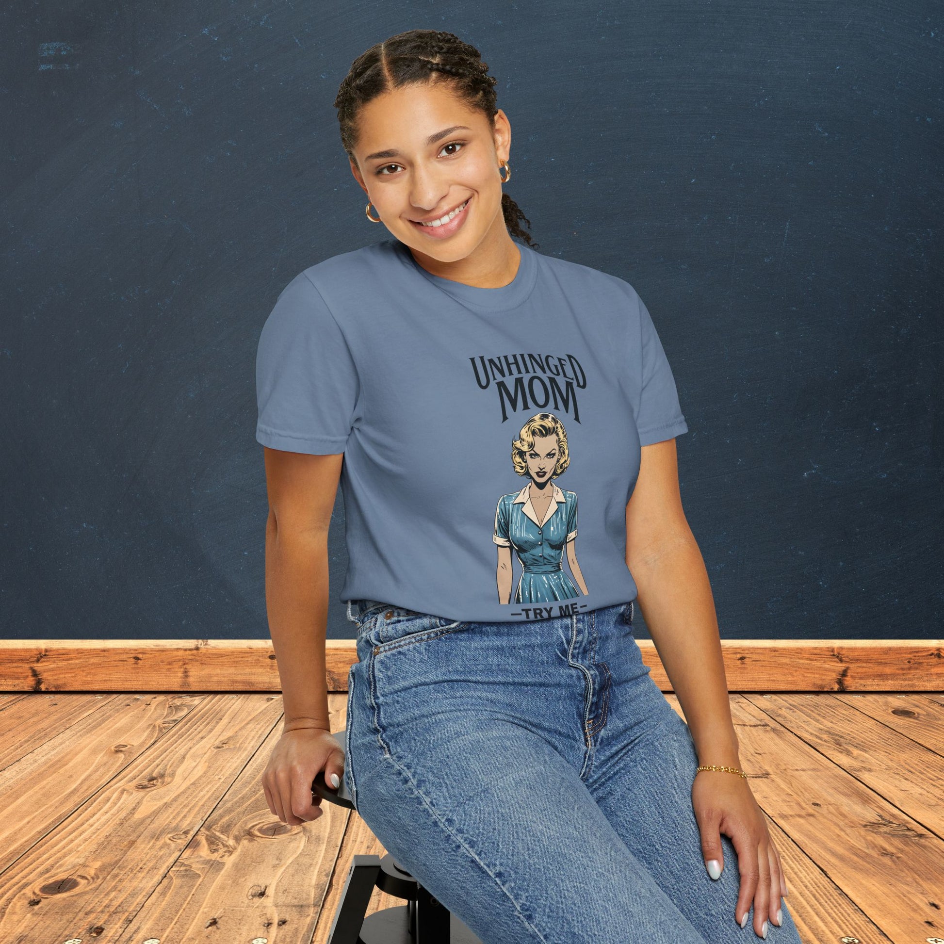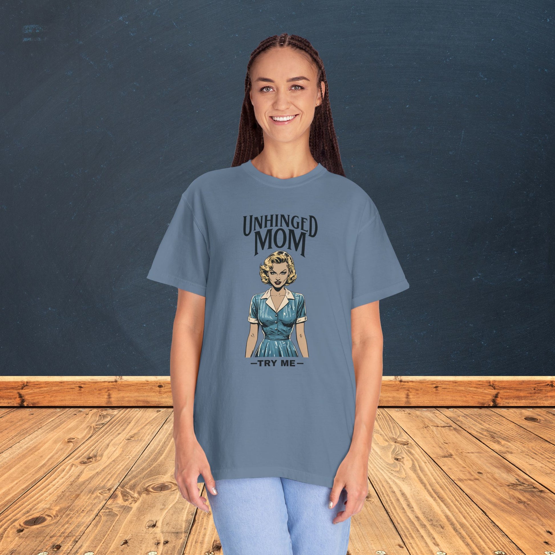 The best mom gift for wild moms! This Unhinged Mom shirt features an angry looking mother challenging you to "try me". This garment-dyed T-shirt is comfortable, durable, and made with high-quality US cotton. Perfect for those looking to make a statement and add a touch of attitude to their wardrobe. Ideal for Mother's Day, birthdays, or just for everyday wear. There are many versions of this shirt so you can find the best matching mama for you!
