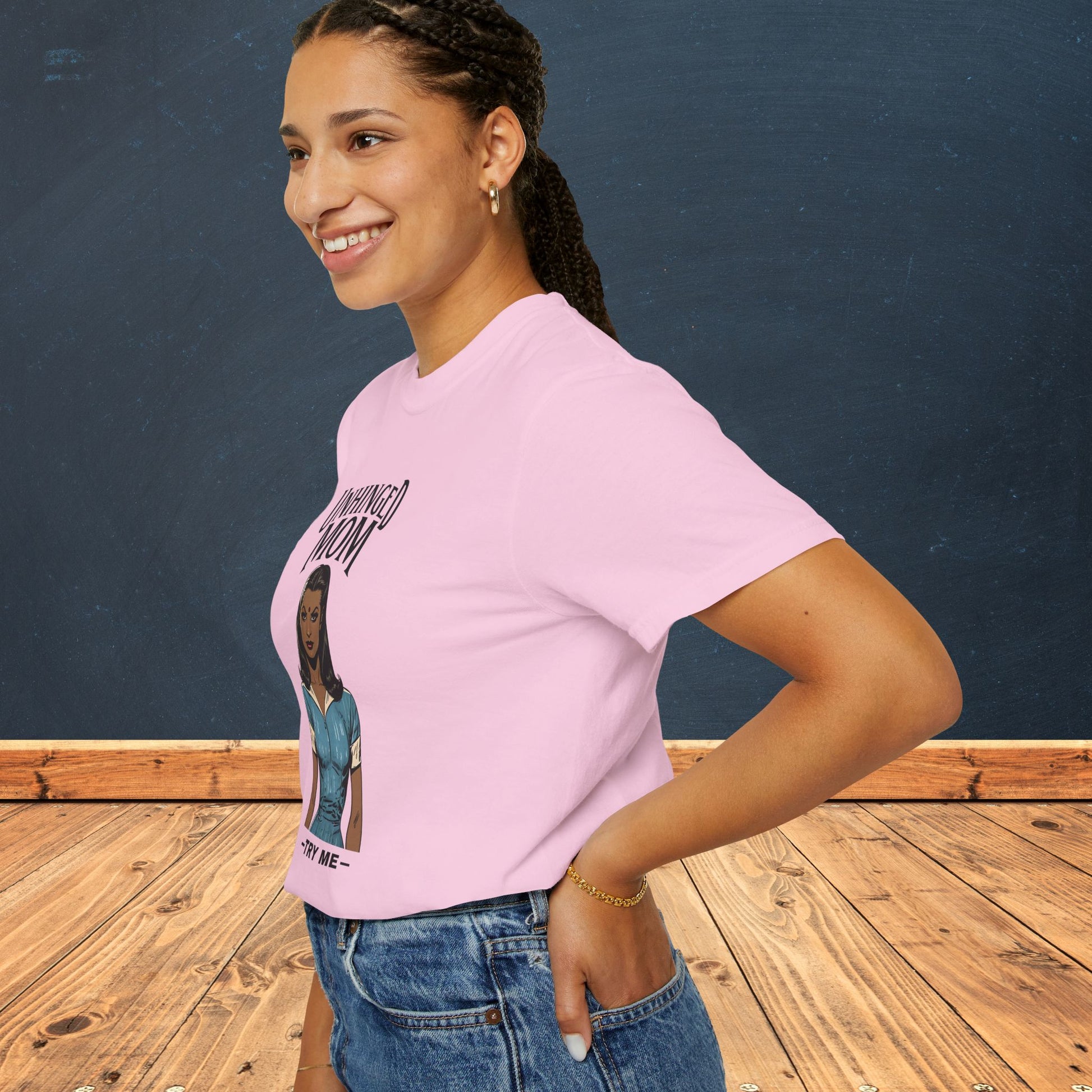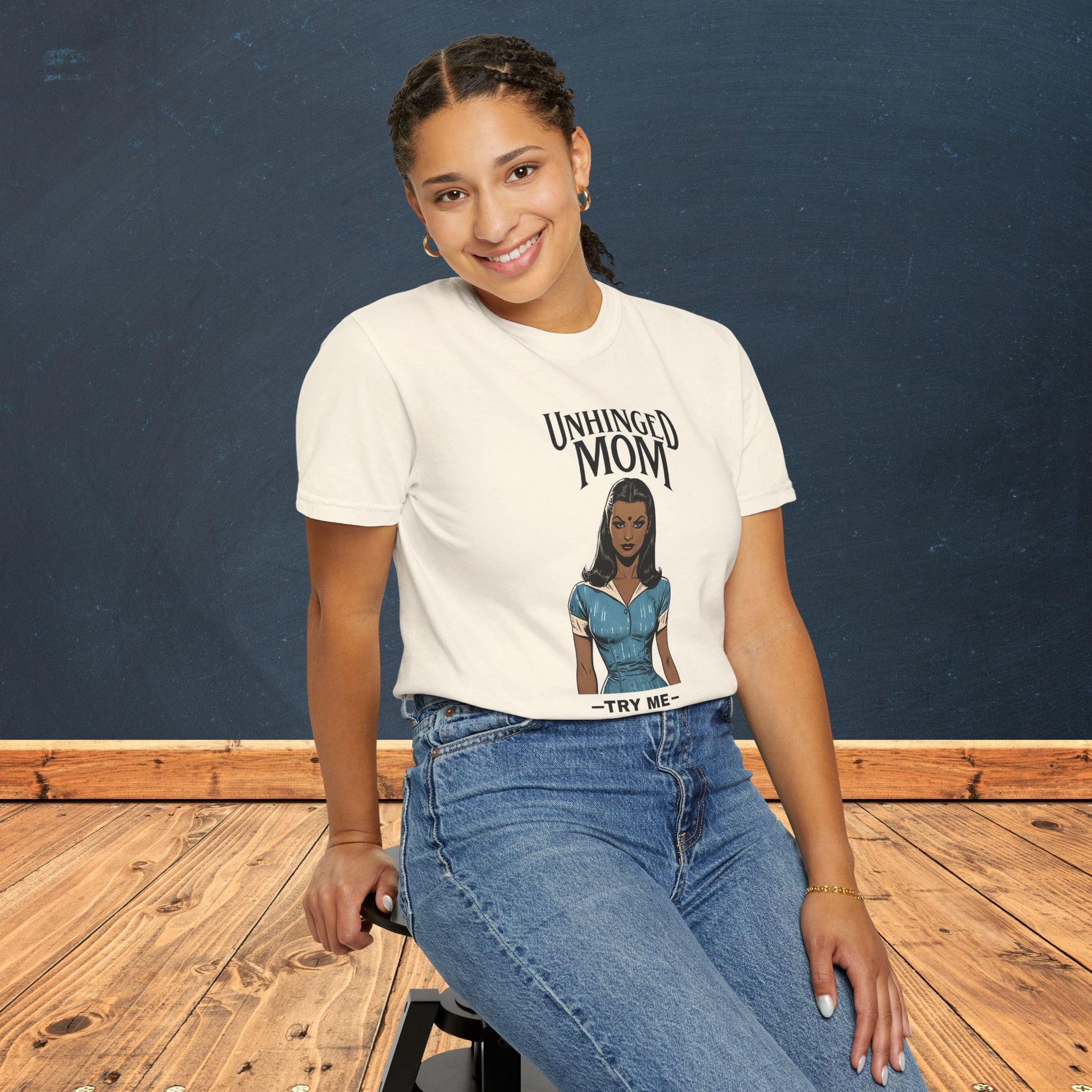 The best mom gift for wild moms! This Unhinged Mom shirt features an angry looking mother challenging you to "try me". This garment-dyed T-shirt is comfortable, durable, and made with high-quality US cotton. Perfect for those looking to make a statement and add a touch of attitude to their wardrobe. Ideal for Mother's Day, birthdays, or just for everyday wear. There are many versions of this shirt so you can find the best matching mama for you!